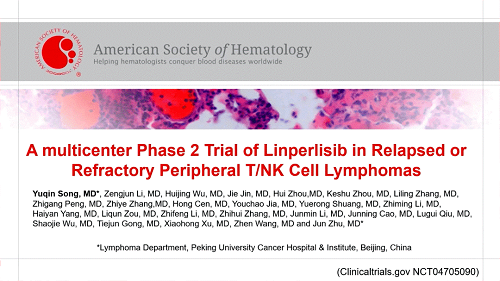 1.Yuqin Song,et,al. A Multicenter Phase2 Trial of Linperlisib in Relapsed or Refractory Peripheral T/NK Cell Lymphomas.2023 ASH. Abstract 306