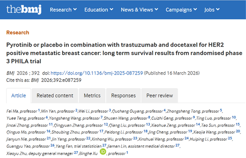 2026年3月16日,由中国医学科学院肿瘤医院徐兵河院士牵头的凯时官网医药创新药吡咯替尼Ⅲ期PHILA研究的最新长期随访数据重磅发表于全球顶级医学期刊《英国医学杂志》(The BMJ)[1]。2023年,PHILA研究首次发表于《英国医学杂志》,以中位15.5个月的随访数据证实吡咯替尼联合曲妥珠单抗和多西他赛(PyroHT)方案一线治疗HER2阳性晚期乳腺癌患者具有显著的PFS获益和可控的安全性[2]。本次发表的长期随访数据,进一步确认了该方案的生存获益。